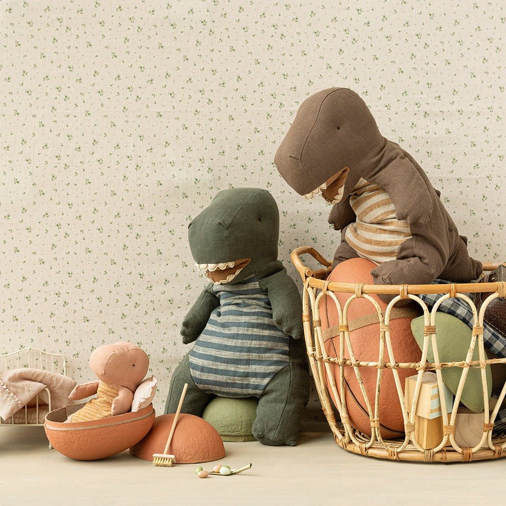 Look at this funny friend! A large Gantosaurus with big teeth has arrived and is ready to play with all of us. It is made in a soft mix of ramie and cotton, the striped stomach is made in a very nice blend of linen and cotton.