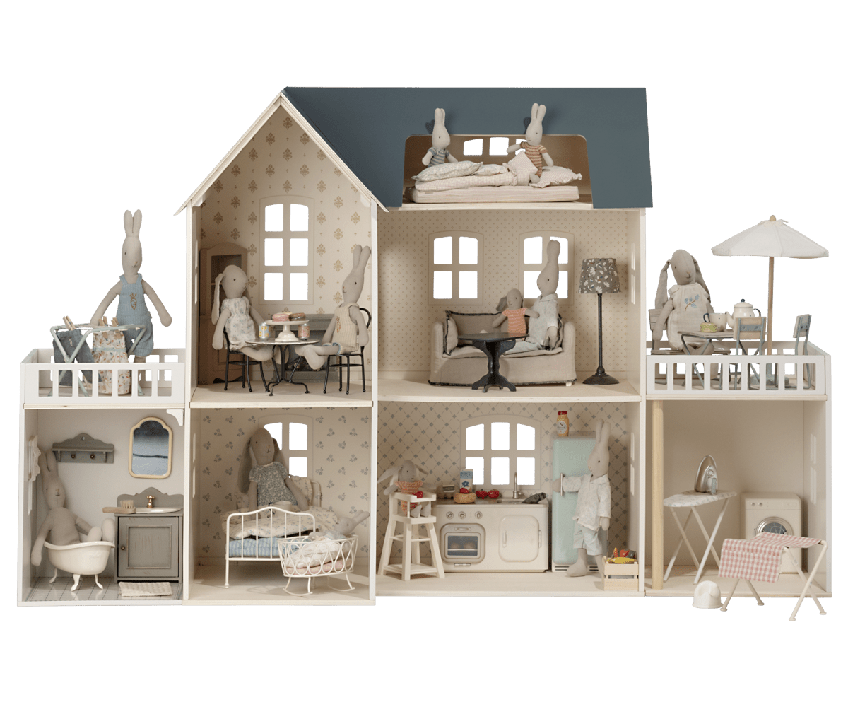 Our beloved Maileg dollhouse is back with beautifully decorated walls and an updated design. Products that fit into the house include: Bunny/Rabbit size 1, 2, micro, my, Teddy family and furniture and accessories in size miniature.