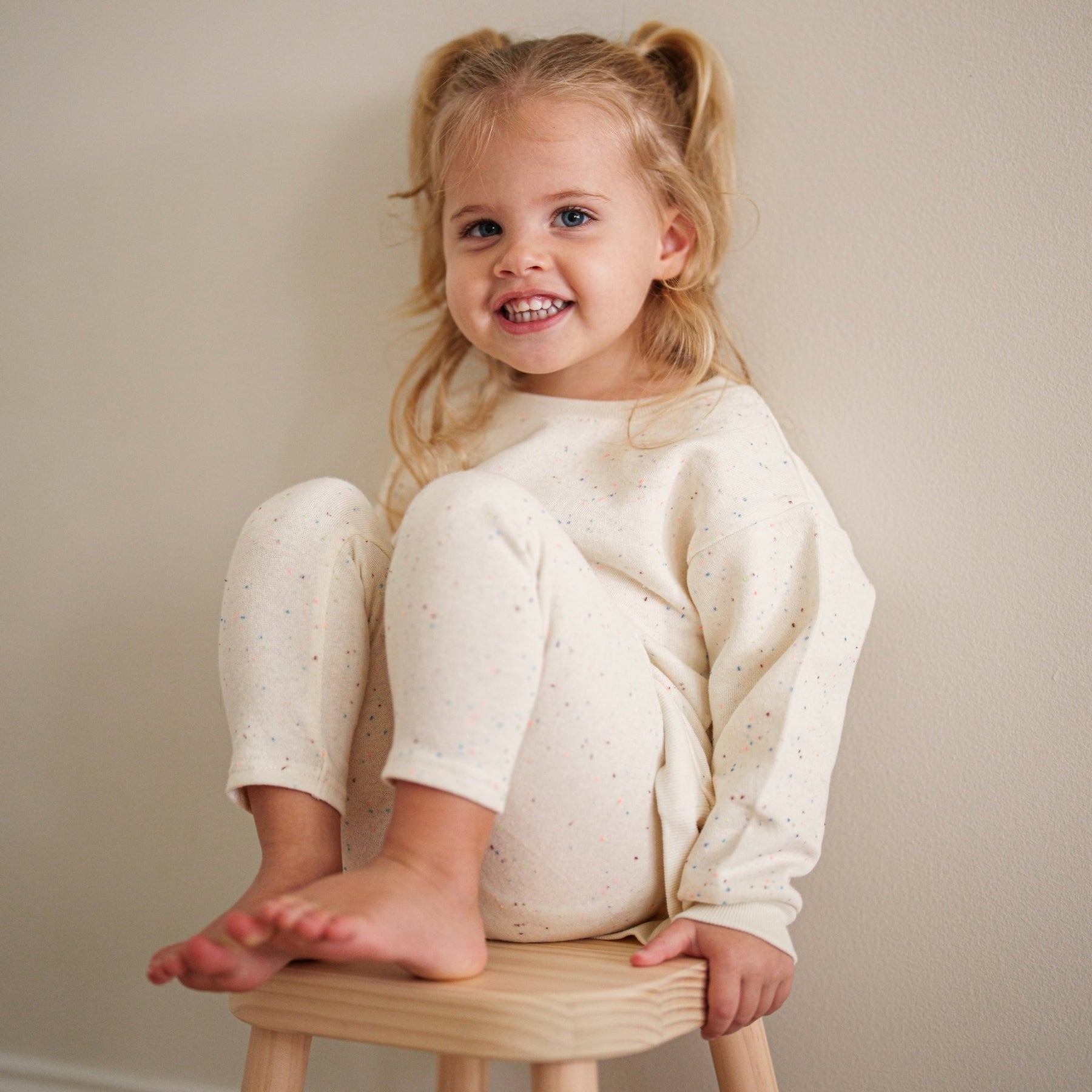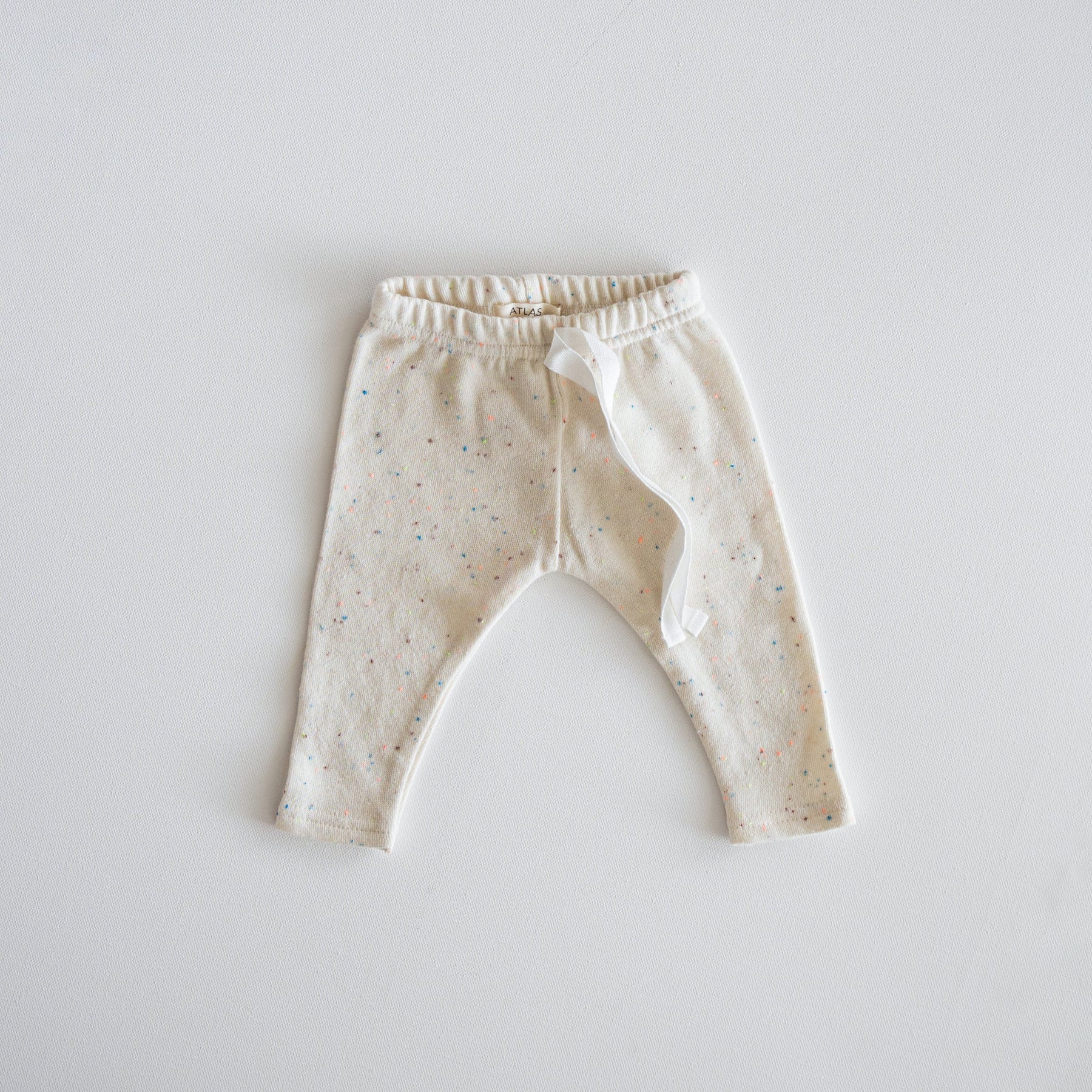 Complete your little one's look with our everyday pant. Designed to be versatile, these pants are as stylish as they are comfortable. Made from 95% cotton and 5% polyester, they're soft, breathable, and perfect for all the crawling, walking, and playing your little monster will get up to. Available in neutral eggnog and a delightful neon sprinkle, these are a stylish and practical choice for everyday wear. Mix and match with our Neon Sprinkle Crewneck or Sweaters for an adorable ensemble that's sure to be a hit!