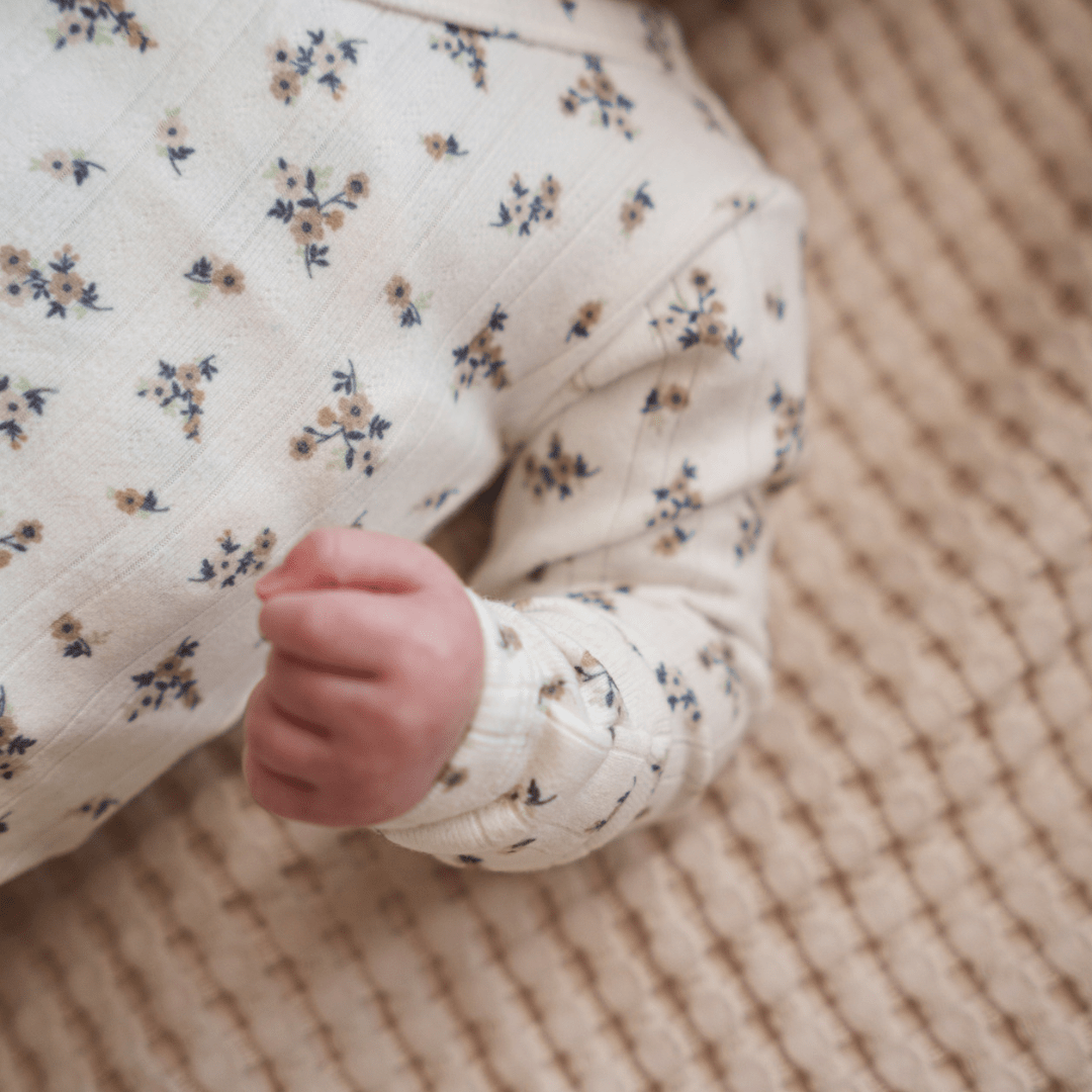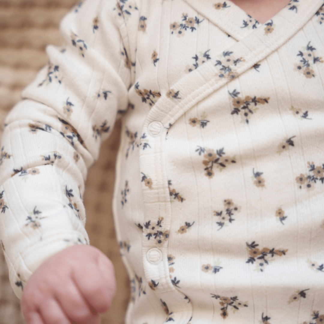 Experience the sheer luxury of this recycled polyester masterpiece - softness redefined with a conscience. Upgrade your baby's comfort and style with our recycled kimono bodysuit, where sustainability meets sophistication in a captivating neutral flower design. Don't miss the chance to make your baby's wardrobe a symbol of change and love for the environment. Shop now and redefine softness with this remarkable bodysuit.