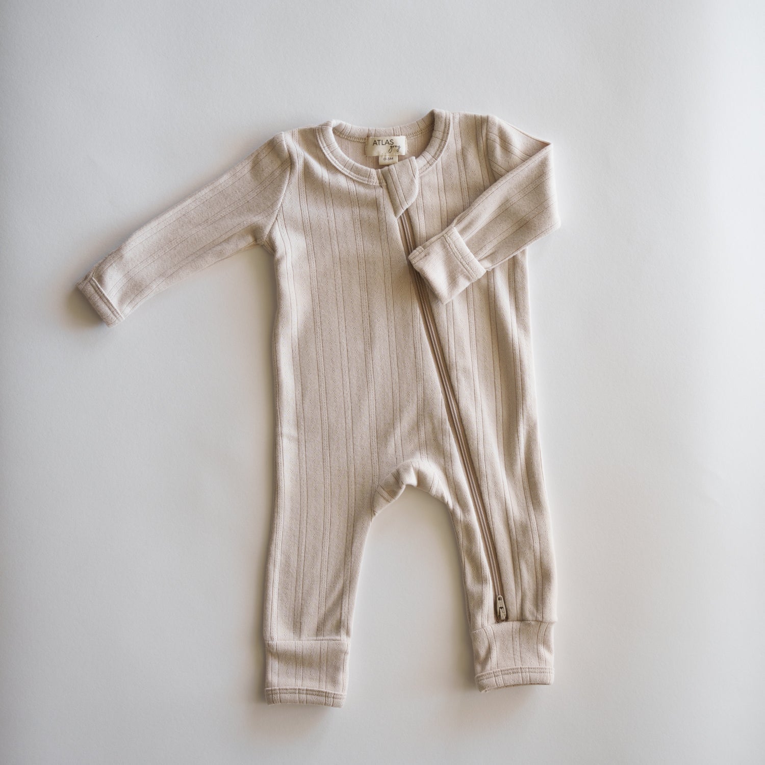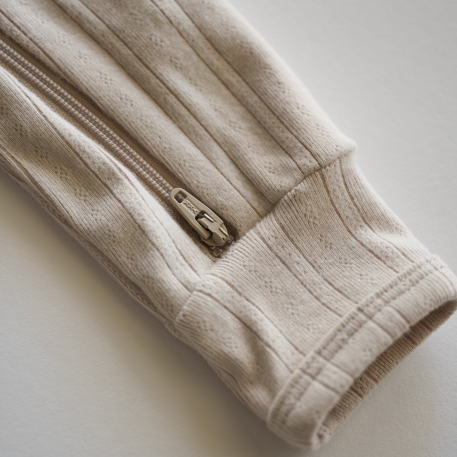 Available in oak, this romper adds a touch of neutral cuteness to your baby's wardrobe. The cotton fabric's natural breathability helps to keep your baby cozy and cool during sleep. Say goodbye to restless nights and hello to peaceful slumber with our recycled zipper romper. Treat your little one to the softest, most adorable sleepwear they deserve.