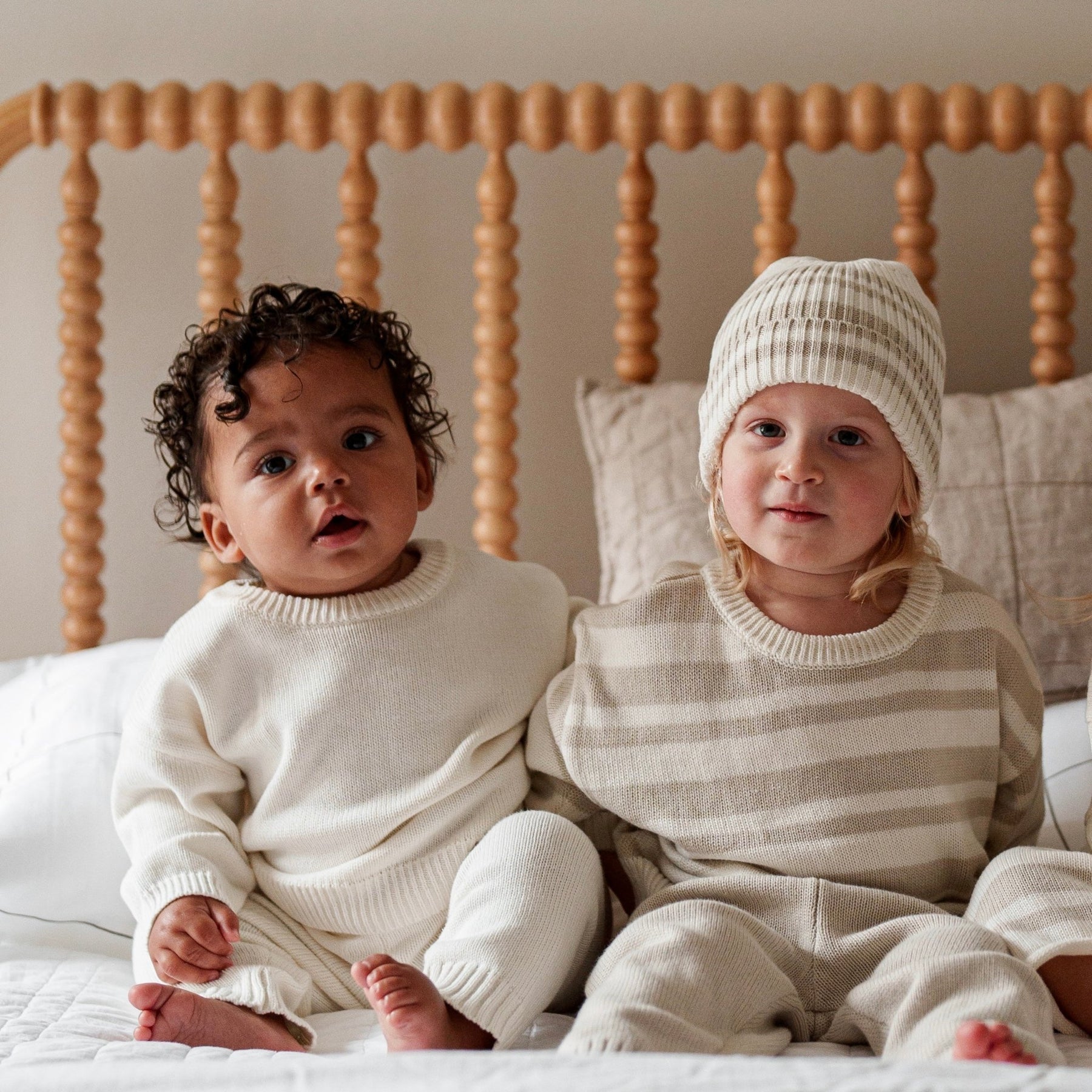 This Organic Knit Sweater is perfect for cooler sweater weather days. This sweater offers a lighter weave for a delicate touch, making it an ideal choice for the milder days of fall. Elegantly crafted in a soft ecru, and also available in ecru with oat milk stripes, it captures the essence of the harvest season with a classic flair. Lovingly made from 100% organic cotton, this sweater helps ensure an environmentally friendly footprint and a gentle caress against your baby’s skin.