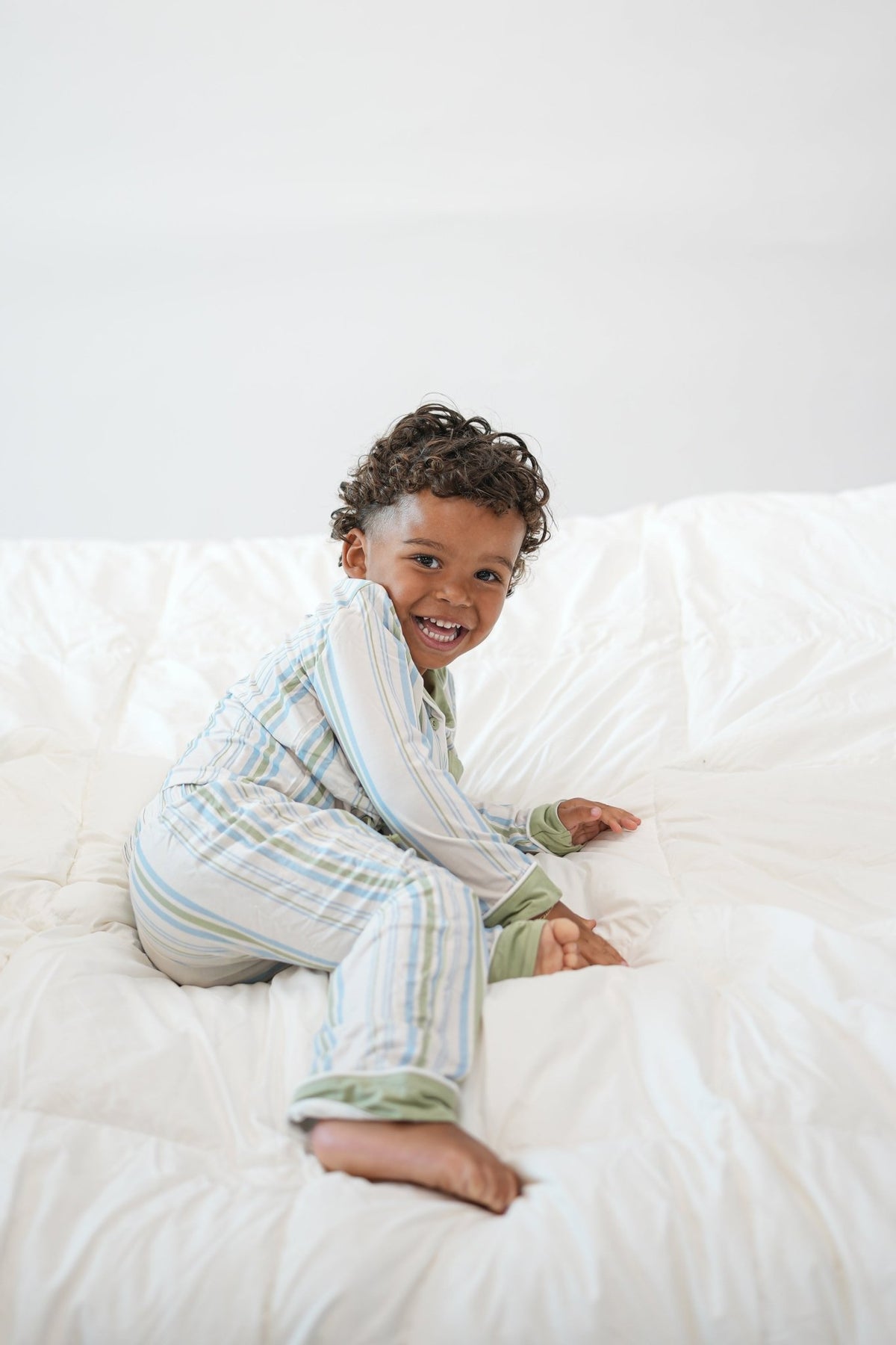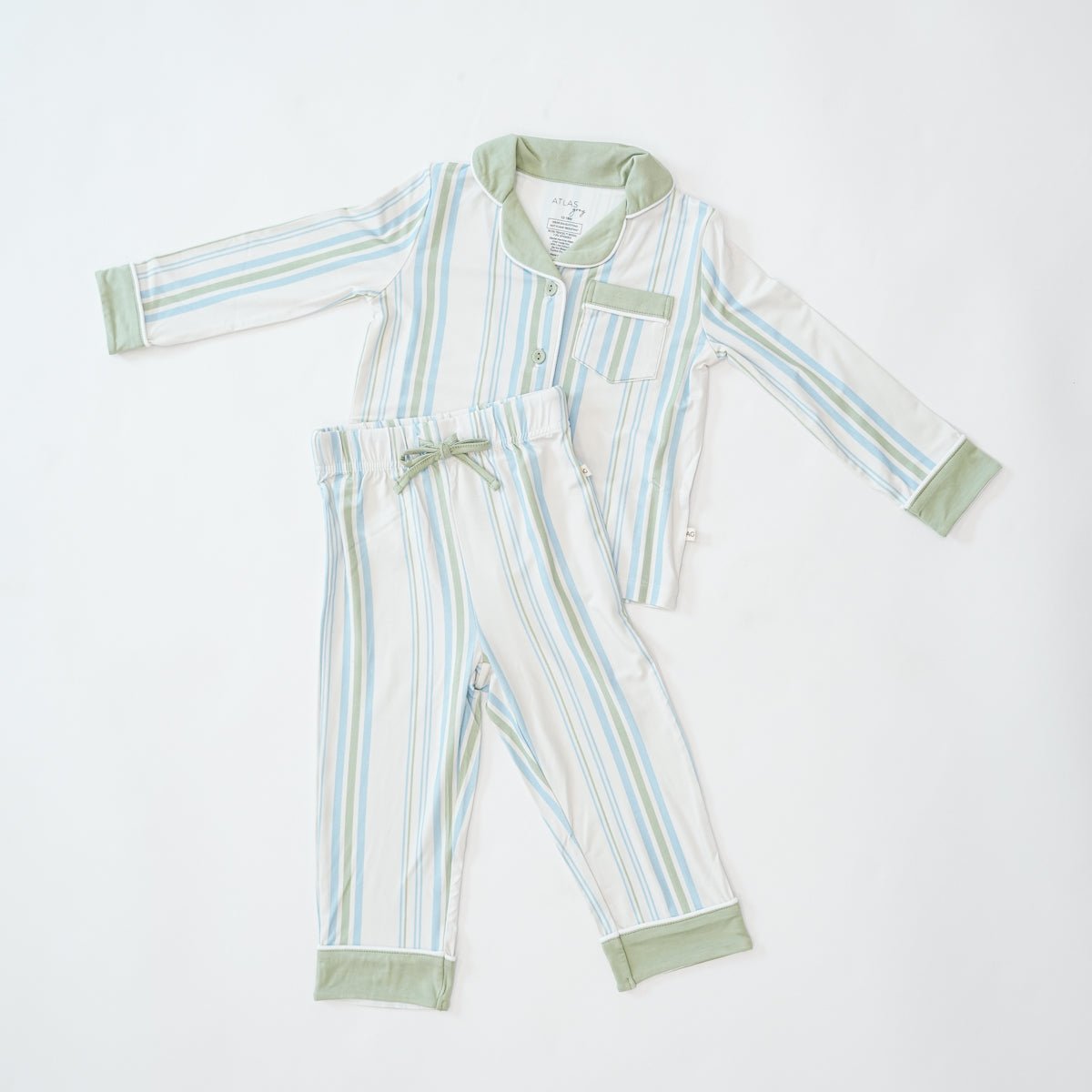 The Button Down Pajama in Madden Stripe is part of the Atlas Grey x Kennedy collection - a limited drop that brings Kennedy's signature aesthetic into the most personal part of the day. The Madden Stripe print runs through both pieces in cream, sage green, and sky blue, and the classic button-down silhouette gives it a polish you don't usually find in kids' sleepwear.